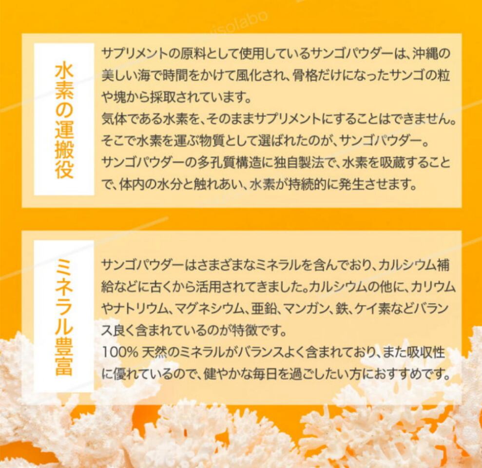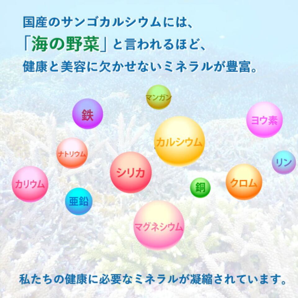 [海の野菜]と言われるサンゴカルシウムに水素を吸蔵させ、体内の還元力とバランスを整えるベースサプリメント。